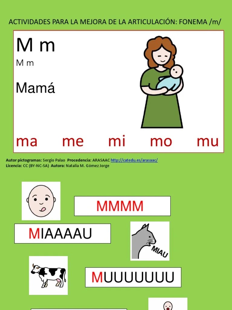 Cada letra es un fonema que, a su vez, se escribe entre grafemas, es decir, diagonales que encierran una letra... (2001) ciceron programa para la adquisición y desarrollo de la capacidad articulatoria. La consonante /m/ es un fonema nasal, bilabial, sonoro.. Para su emisión los labios se unen, con una tensión muscular media, impidiendo la salida del aire a través de ellos.